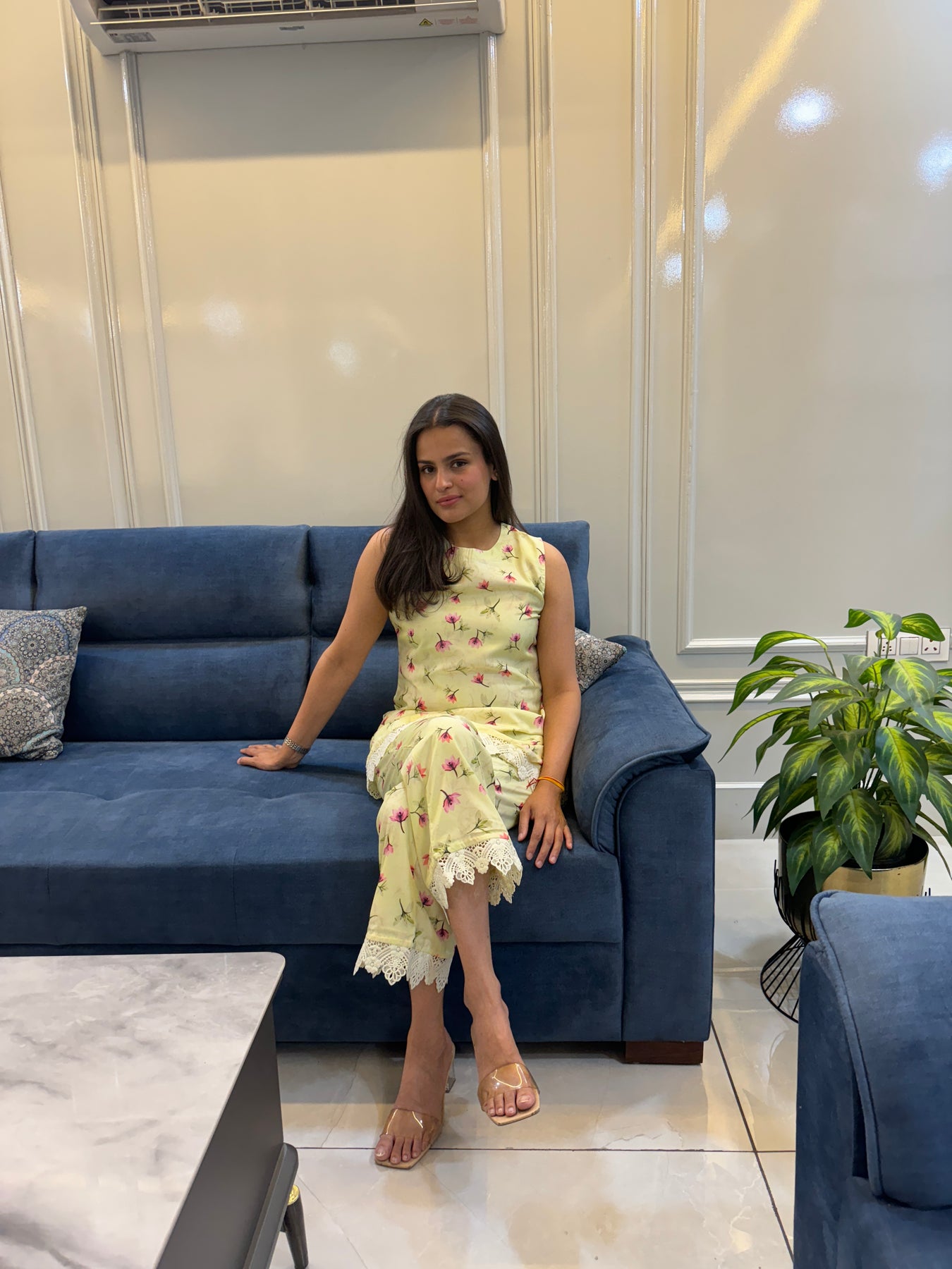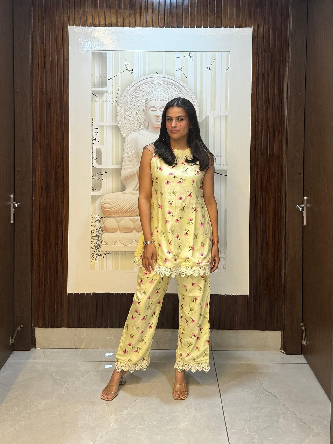 Presenting our blooming “Crape Co-ord” set giving a coordinated floral harmony with delicate tonal lace around the hemline of both top & pants. Experience comfort with the elasticated back & drawstrings on the pants. It is a perfect summer occasion wear which will not leave you disappointed.